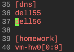 Eventually I started playing with grouping hosts and applying playbooks to groups. The example below defines a group called "dns" with two hosts, dell56 and dell57. Ansible also supports ranges in host names as seen in the "homework" group. It has ten hosts vm-hw00 through vm-hw09.