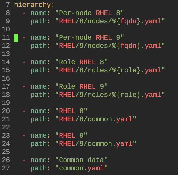 For my environment, I've defined a simple hierarchy based on all hosts (common), Red Hat 8, Red Hat 9, various roles, and individual hosts.