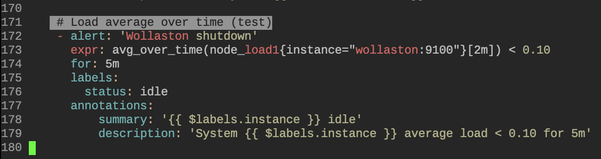 To summarize, Prometheus will alert when the instance's two minute average load has been below 0.10 for five minutes or greater. Note that the alert config also includes a custom label of "status" with a value of "idle". This will be necessary for the notification step.