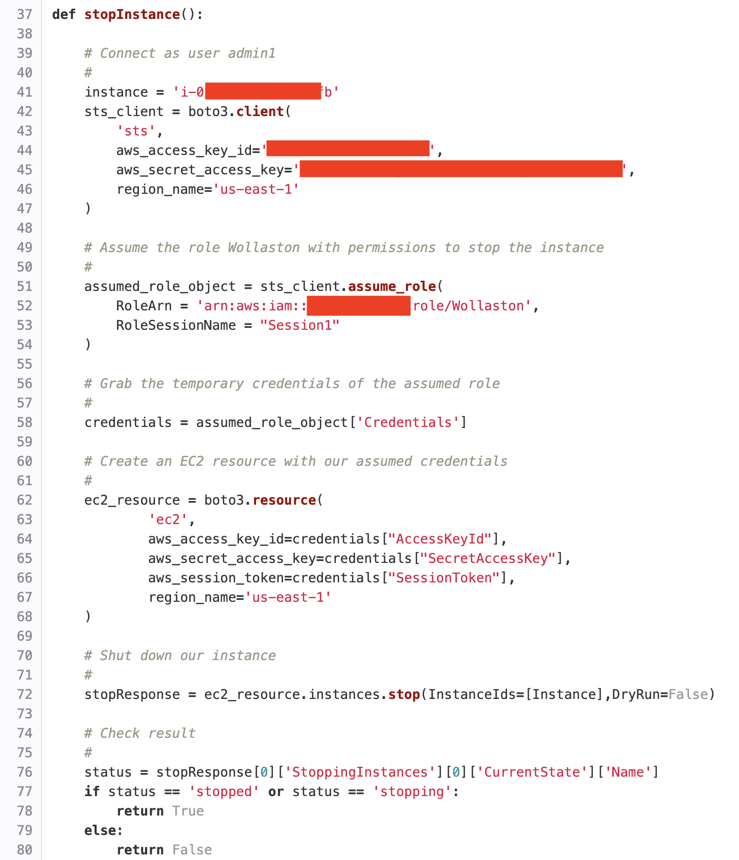 The script connects to AWS as a regular user and then assumes a role that has permissions to call the stop() method on lne 72. It then returns a result to the caller.