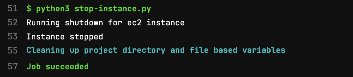 This snippet of pipeline output shows the script running and that it successfully stopped the instance. And because it's in a pipeline, we have a complete record of how, when, and why the instance was stopped.