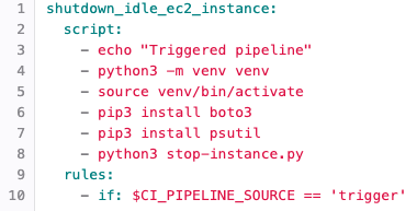 This section shows the portion of the script running on a GitLab server that performs the shutdown. It's using the boto3 module to interact with the AWS API directly.