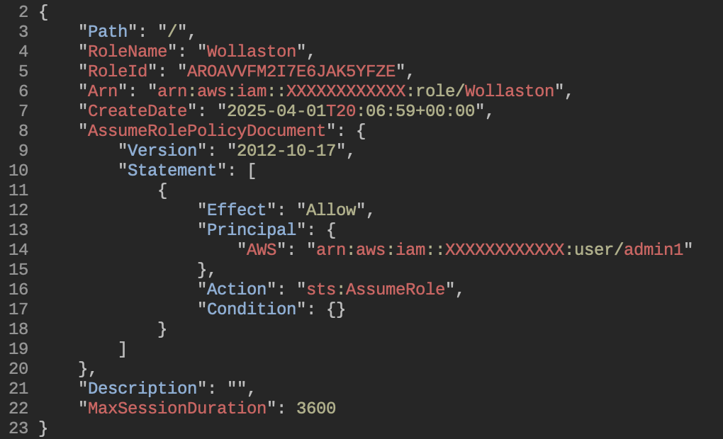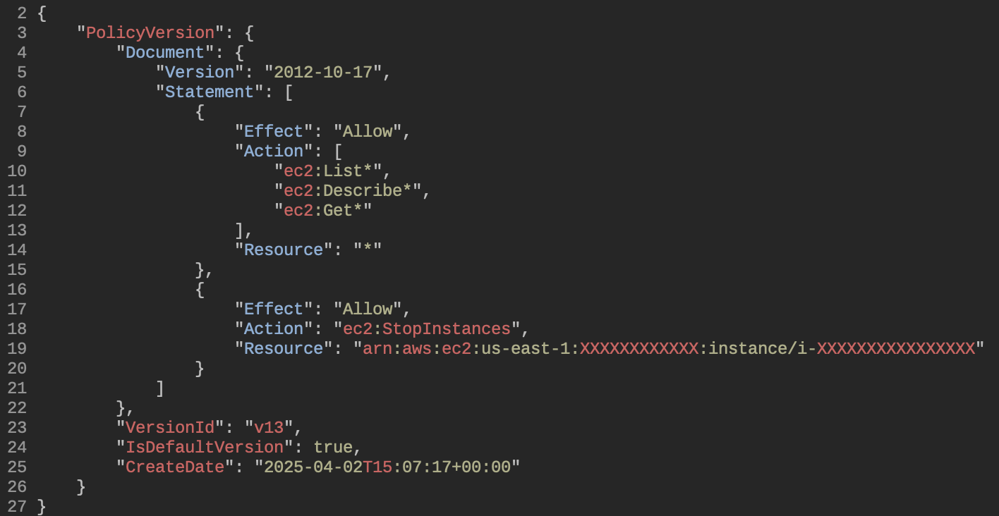 Then we define a set of permissions in the form of an IAM policy. This policy allows read access on EC2 instances in order to describe them. It also very strictly allows the StopInstances action to a single resource. If you needed to terminate more instances, you would define them in the Resource section.