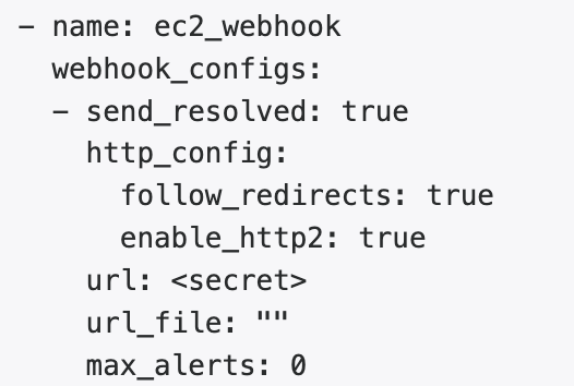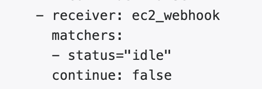 In this bit of config, we're looking for alerts that have a "status" label with a value of "idle". If that matches, send the alert to the defined ec2_webhook.